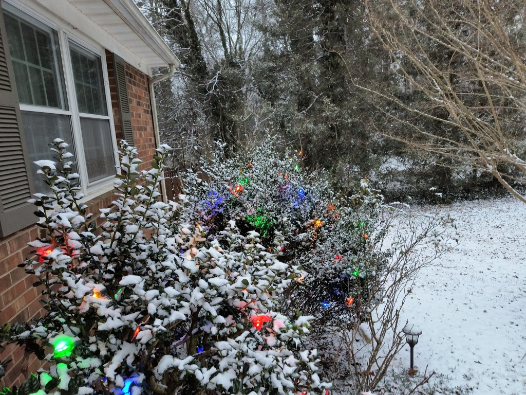 Gratefully, we were able to make it home safely. We were lucky that there was a window of no winter weather all day Thursday, all along our route. Ten and a half hours of driving on perfectly clear highways, we enjoyed the beauty of snow that remained after the huge winter storm that passed through the Ohio valley just days before. We are getting more snow here in North Carolina today. Yay!